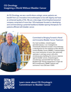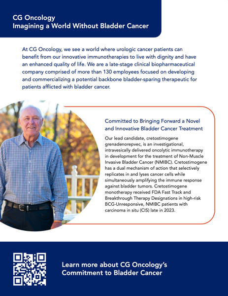 Resources Resources To learn more, click to download our free resources: Doctor Discussion Guide About Bladder Cancer CG Oncology MOA CG Oncology One Pager Doctor Discussion Guide About Bladder Cancer CG Oncology MOA CG Oncology One Pager Find SupportLearn More Bladder Cancer Basics HandbookLearn More Advancing ResearchLearn More Videos Slide OneSlide Two